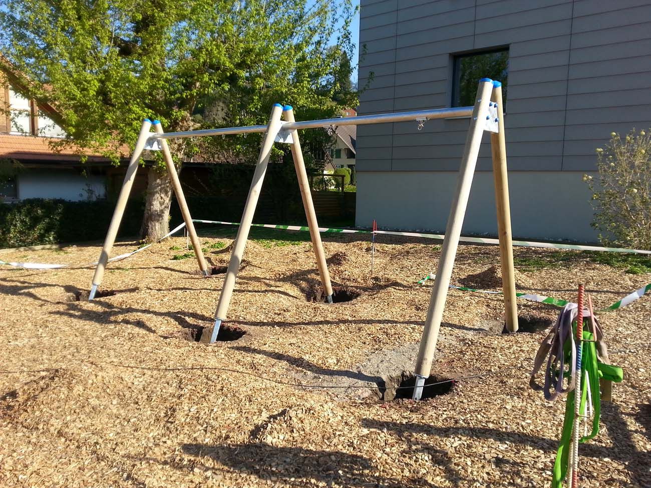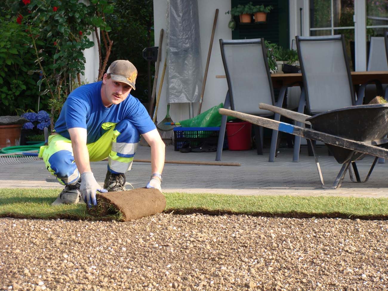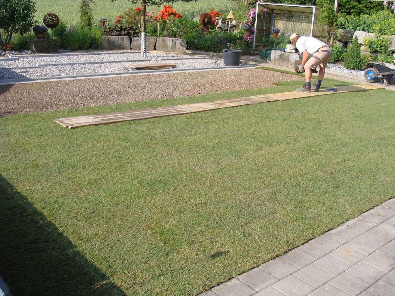 - Ansaat von Rasenflächen oder Verlegen von Rollrasen